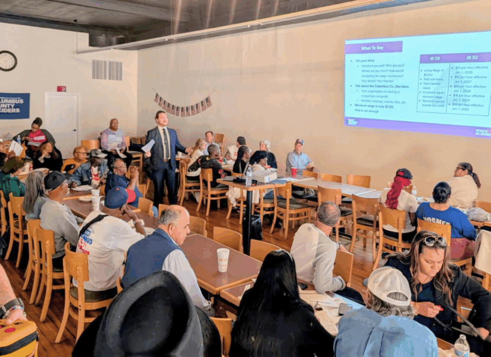 We educate our local community about these pressing economic issues by attending community events, hosting monthly dinners, and working to create a stronger economy that works for everyone in North Carolina.